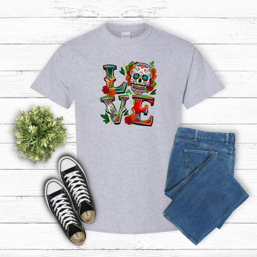 Celebrate Cinco De Mayo with this vibrant, ready-to-press DTF transfer. Featuring 'LOVE' text, with a sugar skull over the O. It's perfect for creating festive t-shirts, bags, and more. Ideal for DIY crafters and small businesses seeking easy-to-apply holiday designs.