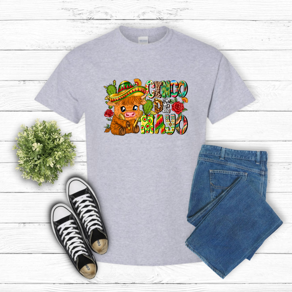 Celebrate with this festive DTF transfer featuring a charming brown heifer in a colorful sombrero and serape. 'Cinco De Mayo' text adds to the vibrant design, perfect for ready-to-press apparel.